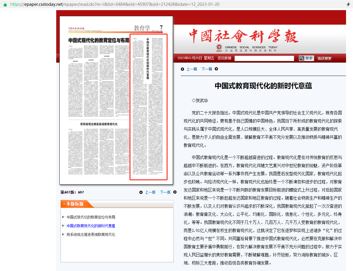 贺武华教授的文章:《中国式教育现代化的新时代意蕴》,全文如下: