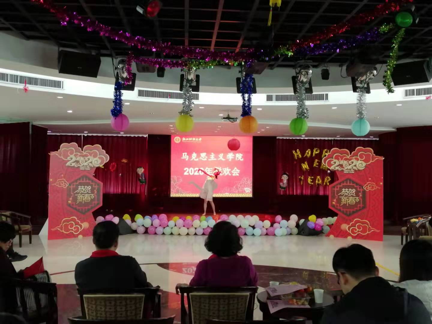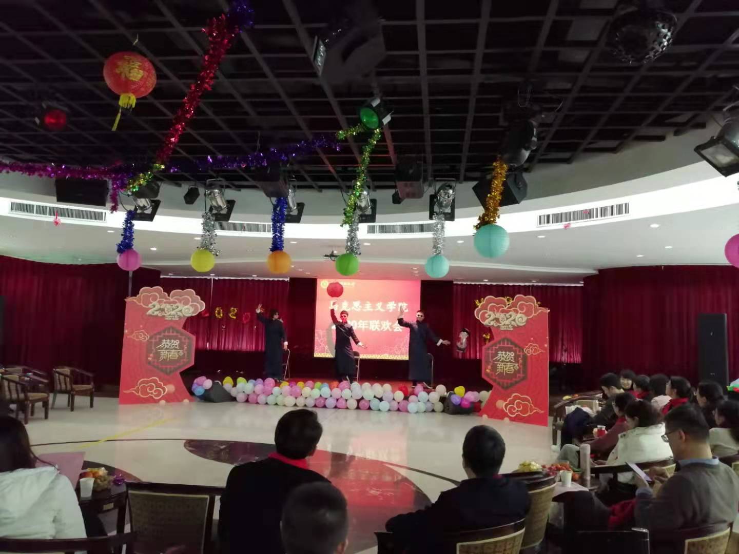 新的发展提出了希望。随后老师和同学们带来了精彩的节目表演:由研究生带来的舞蹈串烧《大鱼+欢沁》兼具唯美与诙谐;马基教研室带来的《我和我的祖国》温情满满;从校外请来的景苑中学教师为我们带来小人舞表演,引来现场阵阵欢笑;赵佳花老师和徐晓燕老师带来吉他弹唱《旅行的意义》,旋律简约动人,歌声清新澄澈;思修教研室的全体老师为我们带来中国传统的健身功法八段锦表演;邓小燕、潘旦、李意三位老师身着旗袍,倾情献唱一曲《月满西楼》,婉转的歌声、曼妙的身姿,令观众陶醉;概论、纲要教研室合唱的《北京的金山上》,华正学老师独唱的《那些花儿》和周浩老师带来的《Anime 中二》将联欢会的气氛一步步推向高潮。