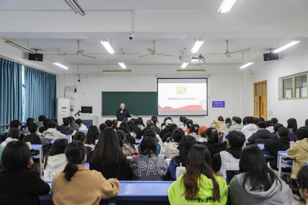 钟晓敏以“不断推进全体人民共同富裕”为主题,围绕共同富裕的理论历史、习近平总书记关于共同富裕的重要论述、共同富裕的科学内涵与实践路径、浙江高质量发展建设共同富裕示范区等方面进行了深入细致的讲解。他同财税学院学生分享了改革开放以来生活的巨大变化,回顾了中华民族千百年来对共同富裕的追逐和梦想,鼓励同学们将职业规划与时代发展相结合,为实现全体人民的共同富裕贡献力量。
