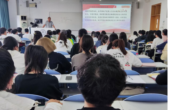 展示一:贺武华老师以生动活泼的案例开讲,引导学生进行沉浸式思考,引入李大钊“震撼中国民族魂灵”的《青春》,集体观看庆祝中国共产党成立100周年大会上少先队和共青团员集体发出的“请党放心、强国有我”铮铮誓言的视频,引发同学们对青春的激情澎湃,从“我们处在一个什么样的时代”进行讲解课程重点内容,即启发学生在理解新时代中理解青年的立志立学。