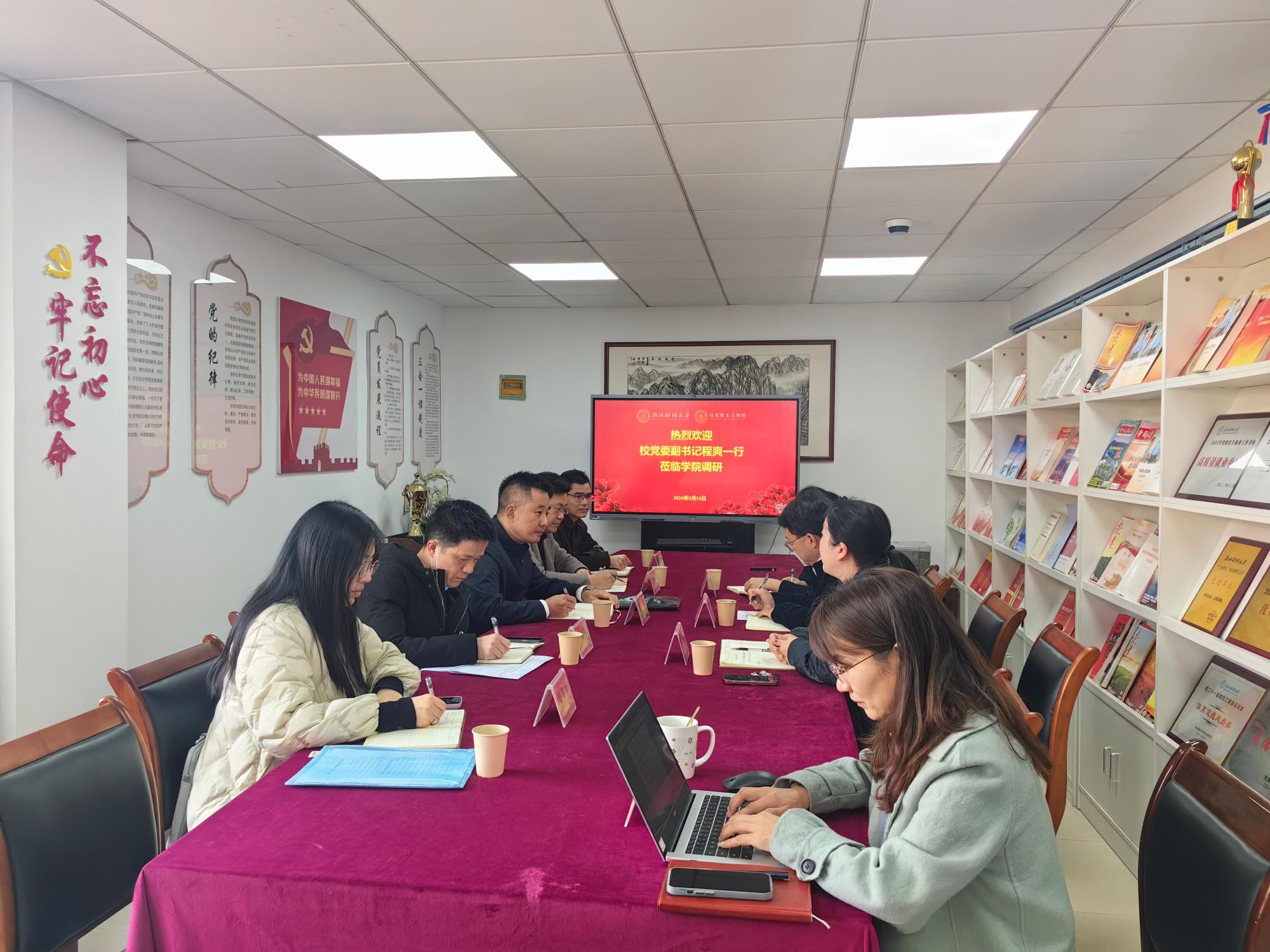 近年来取得的成绩表示肯定,并对学院未来的发展方向提出了明确指导:一是紧密结合学校新财经战略,充分发挥思政课“融合”与“引领”作用,深入阐释党的理论立场观点方法,提升课程感染力;二是要不断加强思政精品课程建设,紧密结合学校办学特色和浙江地域特征,进一步凝练思政课教学特色;三是要紧密围绕浙江经济社会进步发展的鲜活案例与新时代中国特色社会主义伟大实践讲深、讲透、讲活习近平新时代中国特色社会主义思想的内在逻辑和精髓要义。