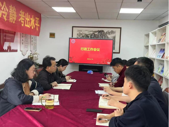 于2024年4月16日上午在学院楼504A会议室召开行政工作会议。会议由学院党委书记高燕主持,学院院长贺武华,副院长邢雁欣及全体行政人员参加了会议。