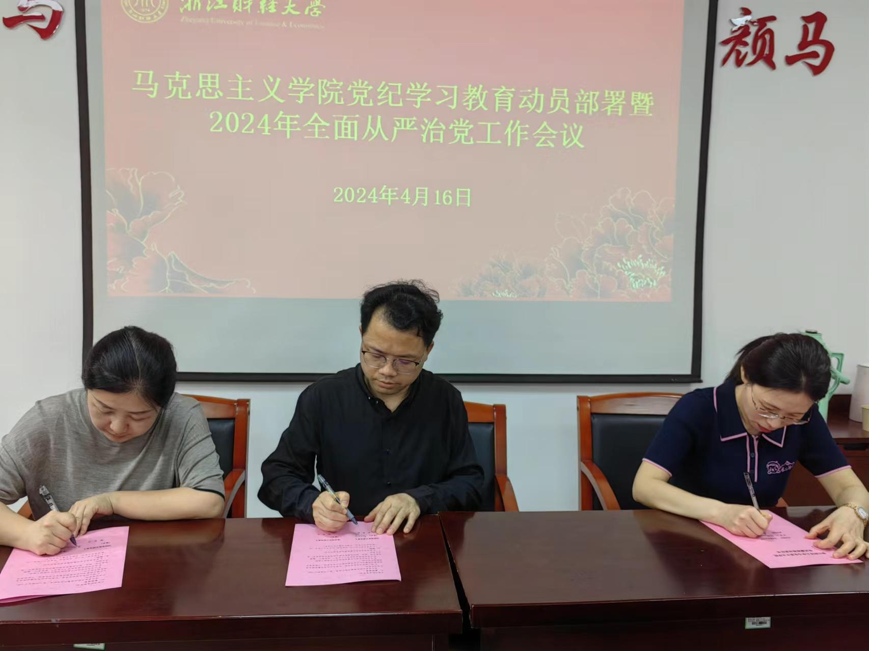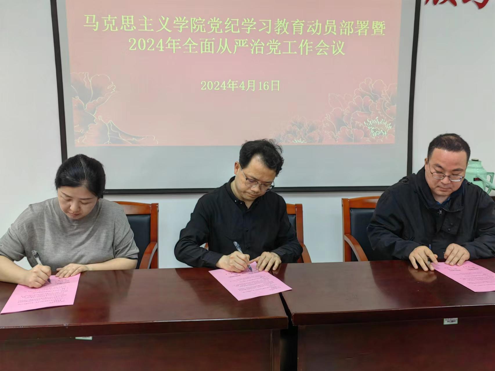 会上,学院党政主要负责人与学院重点岗位成员代表分别签订了2024年党风廉政建设主体责任书。会议还对师德师风建设和意识形态工作进行了专题研究,传达学校校园安全隐患大排查大整治工作会议的精神并进行专项落实布置。