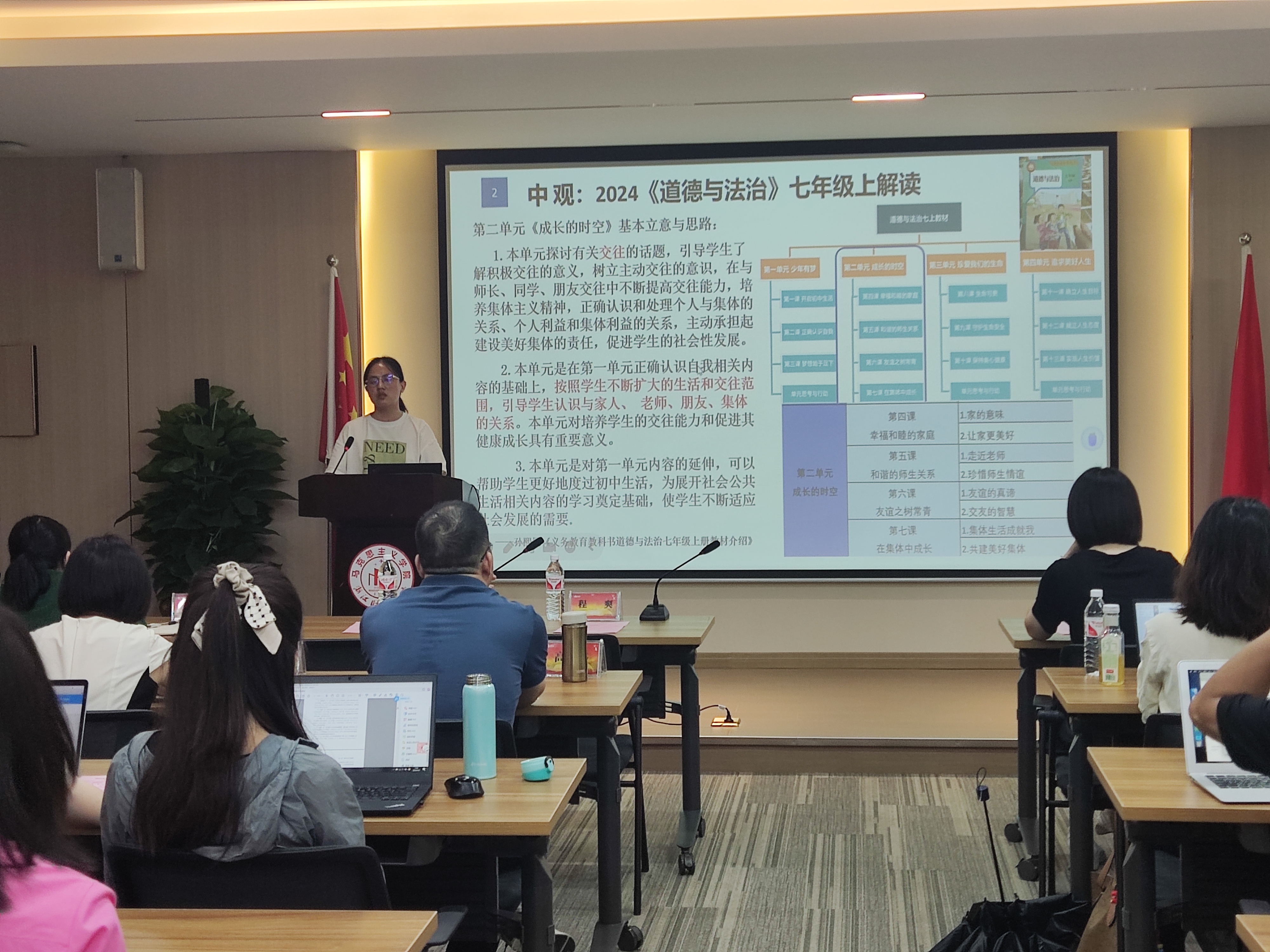 学正中学钟沁元老师以《依表扣本,逐光而行》为题,对2022版课程方案和课程标准进行了解读,并重点围绕七年级上《道德与法治》教学内容,讲解了教材四个单元的基本立意和思路,厘清了初中阶段思政课与小学和高中之间的内在逻辑和联系。钟老师以“基本经济制度”和“改革开放的下沙礼赠”两个章节为例,展示了项目化、情景化、实践化教学的教学创新实施方式。