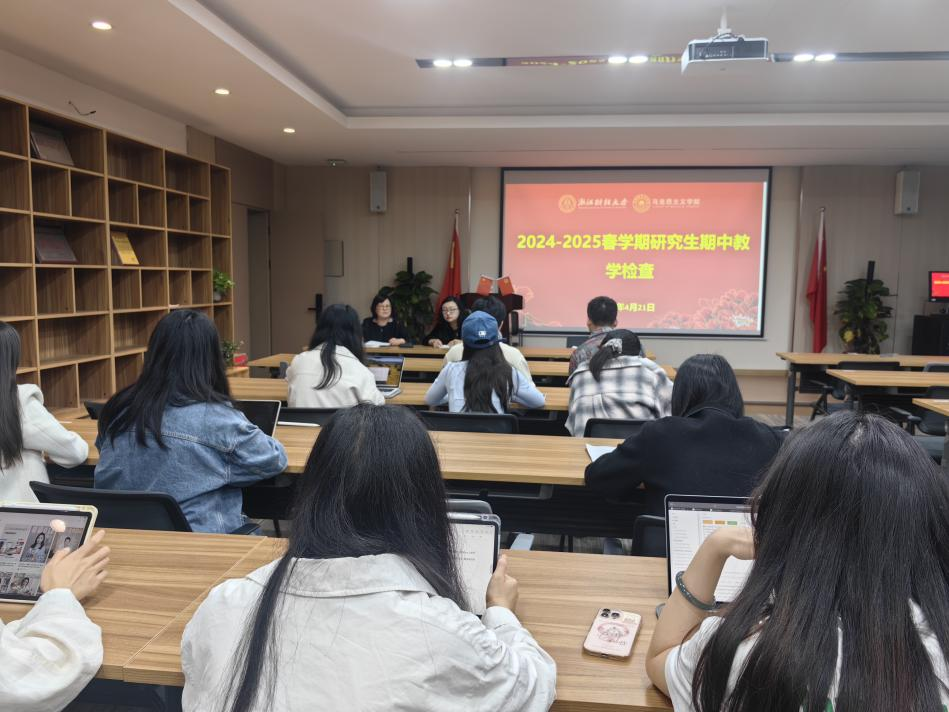 在3-206组织开展了2024-2025 学年春学期研究生期中教学座谈会。研究生院督导康莉莹老师、研究生秘书及2024级全体研究生参加本次座谈会,副院长邢雁欣主持会议。
