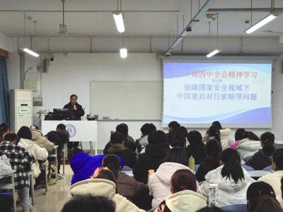 2025年12月4日,李占荣副校长为25法学4与25社会工作专业的同学们带来了一场内容丰富、立意深远的专题讲座。讲座围绕“保障国家安全视域下中国重启对日索赔”这一主题,展开了系统、深入、有力的论述,体现了历史与现实相贯通、法学与政治相结合、战略与政策相统一的鲜明特点。
