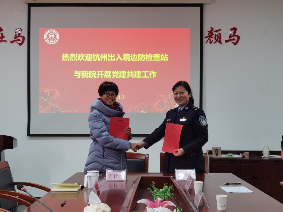 委员会教工第一党支部和中共杭州出入境边防检查站执勤四队党支部共同签署了《党支部结对共建协议书》。双方本着“资源共享、优势互补、注重实效”的原则,通过共建活动平台、分享工作资源、交流工作经验、解决实际问题等途径,建立互帮、互学、互助的有效机制,实现党支部良性互动。共建时间为2021年1月7日至 2024年1月6日共3年时间。共建内容包括: