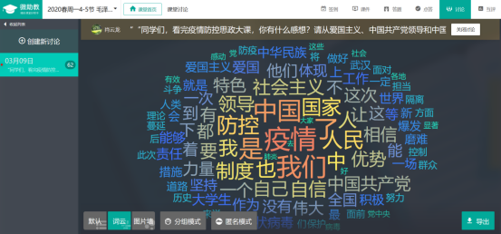 老师在直播结束后和学生讨论的主题,而每一个问题之下都有数百条甚至上千条学生的热烈回应。韩金起老师班上18经贸1班的王烨同学追问“此次疫情防控过程中,哪些做法在中国可以做到,其他国家不可以,我们的优势有哪些?”来自肖云龙老师班上的寇雅洁同学从爱国主义、中国共产党领导和中国特色社会主义制度的显著优势和“四个自信”的角度分别谈了自己的看法;冯庆旭老师班上的郑烨波同学认为:“在重大疫情面前,生命可以脆弱的只是一个个冰冷的数字,同时生命也是顽强的,顽强到可以奋不顾身的奔赴战场。此次疫情让我们看到了青年的力量,也让我感受到了自我担当意识,危险当前,总是有人要付出,别人可为,我为何不可为呢?”