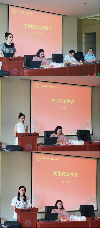 2021届优秀毕业生、现浙江财经大学金融学院辅导员廖丁瑶作为学院优秀院友代表向新生们分享了自己在读研期间的几点经验。她给出了三个关键词,分别是学习、规划和生活,启示同学们要把握好研究生的三年时间,规划好自己的人生并为之努力。2019级伦理学专业的况玉婷同学作为老生代表,也向学弟学妹们分享了自己的这两年在成人影院