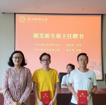 学院历来十分重视班主任队伍建设,今年也为两个新生班级配备了班主任,聘请了程能的、郑子律老师作为马中化和伦理学的班主任,学院副院长邢雁欣为新生班主任颁发了聘书。
