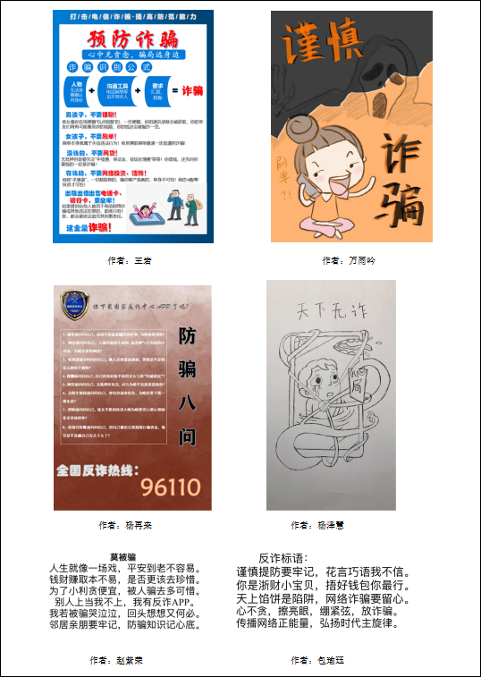 活动持续开展一周,活动期间同学们以“反诈宣传”为主题进行了多种形式的创意展现,内容包括分享经验、警示学生日常诈骗现象、分享举报方式等,形式涵盖宣传标语、原创海报、反诈短文等。27日,由团支部书记、班主任共同对参赛作品进行评比。最后,王岩、赵紫荣、万雨吟、杨泽慧、杨再来、包瑜珏创作的六组作品获得优秀奖。