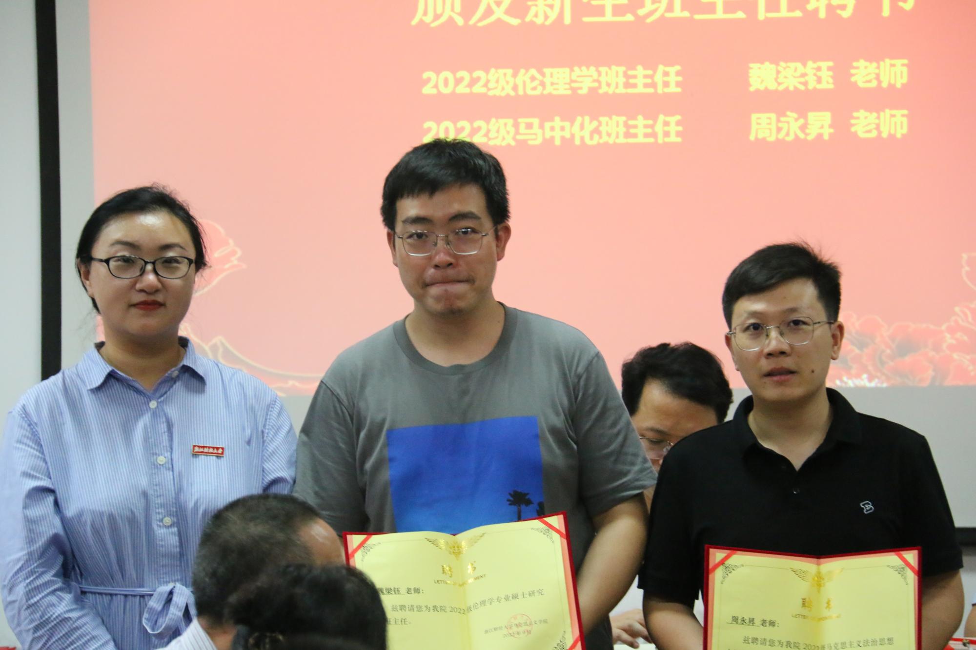 学院历来十分重视班主任队伍建设,今年同样聘请了魏梁钰、周永昇老师作为伦理学和马中化专业的班主任,学院副院长邢雁欣为新生班主任颁发聘书。