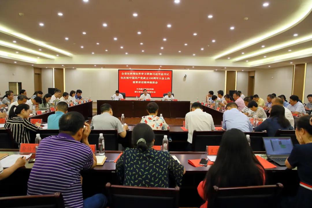 为深入学习贯彻习近平总书记在庆祝中国共产党成立100周年大会上的重要讲话精神,深刻领会其时代价值、重大意义、丰富内涵和核心要义,进一步推动全省社科理论界学习研究宣传好重要讲话精神,7月2日,全省社科理论界学习贯彻习近平总书记在庆祝中国共产党成立100周年大会上的重要讲话精神座谈会在浙...
